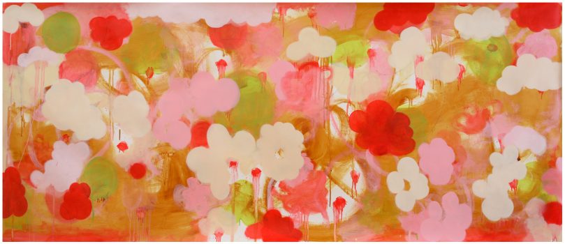 Much of the work is sexual- some of it veiled, some explicit, but, as with all of Spielman’s work, her paintings bear a dual meaning. In the painting “Sugarbush,” for example, the shower of white smudges can look like falling petals, a first snowfall, or ejaculation. And the main object in “Things to Suck,” resembles a lollipop, however, suspended testicles loom overhead. The juxtaposition hints at two separate realms of experience, while also displaying Spielman’s bold and mischievous sense of humor.