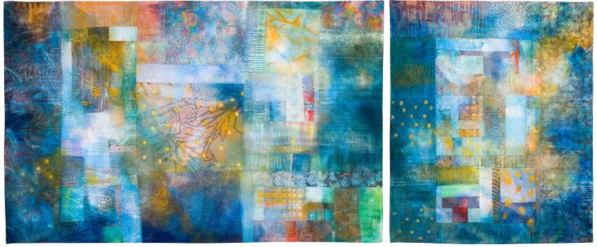 Deidre Adams specializes in painting, textiles, paper, and found objects. Although abstract in design, Adams’s mixed-media textiles incorporate structural elements—with “vertical and horizontal divisions reminiscent of windows and doorways”—or strong horizon lines evocative of the landscape. Inspired by the American Southwest, she references the “effects of time and transformation in her abstract paintings and textile work, which focus on the exploration of shape, color, texture, and mark-making.”