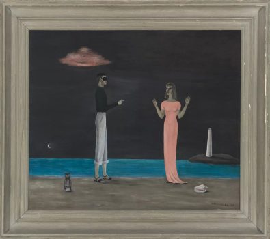 Once claiming, “It is always myself that I paint,” Gertrude Abercrombie (1909—1977) sought to highlight her interiority through her deeply personal and enigmatic art. Working in a subdued, moody palette, Abercrombie devised a unique lexicon of recurring motifs that she inserted into her landscapes, portraits, and still-life compositions. Often times called “the queen of the bohemian artists,” she hosted many jazz musicians at her home at parties, including friend Dizzy Gillespie.