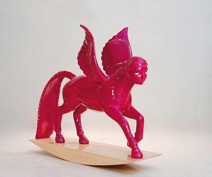 “Nevertheless,” she continues, “these various objects are also different due to the incorporation of religious iconography: such as the perfume bottle shaped like a Ka‘ba, or a model of the Medina mosque as a timepiece. In this work, I am interested in this curious intersection, or even paradox, in the case of material objects that are not intrinsically religious but do evoke religious sentiments. I was intrigued by the hybridity of these objects, that is, as ‘non-religious religious objects.’ Therefore, my main interest is in the way these objects appear to the viewer, in their peculiar hybridity and nature of their aesthetics.” She explains, “Barakah Gifts, first of the series, is a flask that is commonly used by pilgrims to carry the holy water (Aab-e-Zamzam), from the spring located near the Ka‘ba. However, in its function as a flask, it can be used to hold any kind of (non-religious) liquid as well. In pre-modern times as well, the flask has served many functions and is a symbolic object on many levels as well. This particular flask has a shiny, golden exterior with an intricate Arabesque pattern on the sides of the flask. Its surface treatment of 24-carat gold tonality makes it an interactive piece due to the mirror effect. The sculpture is made of fiberglass and supported by a metal structure inside to withstand outdoor weather conditions.”