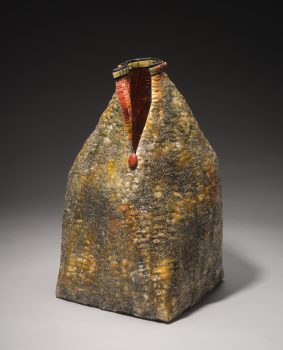 Jackie Abrams was born in New York, New York. “I have been a fiber artist for over 40 years, using and adapting well-practiced basket-making skills. My materials include silk and cotton fabrics, archival paper, wire, sand, thread, buttons, encaustic wax, and acrylic paints and mediums. I work intuitively, the colors and textures of the materials informing the vessels I create.