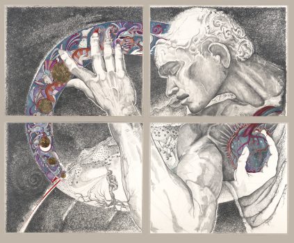 During the past thirty years, as a professional artist, her art has been an exploration of global ideas from science to politics, mythology to social media, and cosmology to human emotion. Experimentation remains central to her process, as does the human form, which results in emotionally powerful artworks that turn her quest for universal and self-exploration back on the viewer. Torres is the mother of three sons, Isaiah, Zach and Matthias. This drawing, Samba Pa’ Tí, is a tribute to her love for her late husband, painter Rory Wagner.