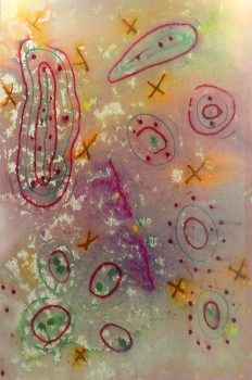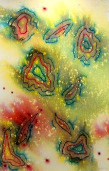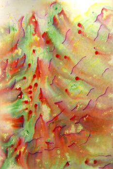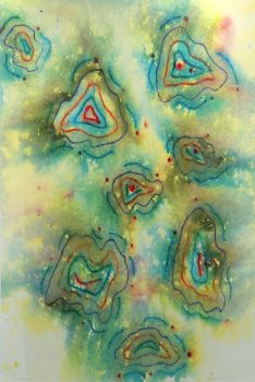 In the summer of 2010, Szaggars-Redford began creating her “Rainfall” series, inviting rain showers to become a major instigator and her collaborator with Nature. In this series Redford provides the paper with her abstract watercolor pigment compositions – she then waits for the monsoon rain in the New Mexican High Desert and places her work in these showers. To highlight her fascination about this process, she created her Rain Painting art film and invited Icelandic Musician/Composer David Thor Jonsson to score music to her film.